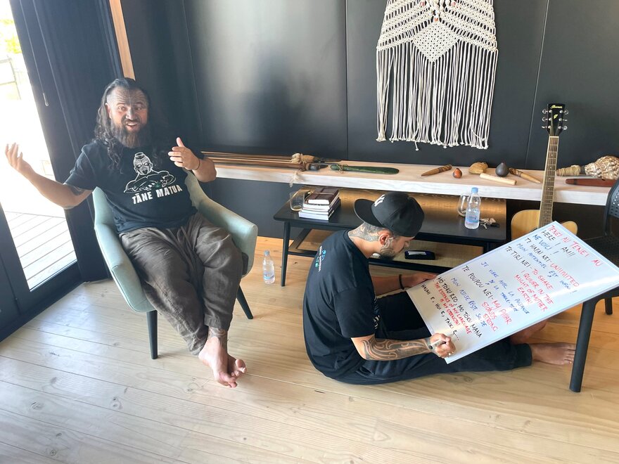 Ngarino Te Waati (sur le fauteuil) présente certains principes de la cosmogonie maorie et des rituels incarnant les liens avec la nature, avec l’aide de son neveu Te Harawira (en train d’écrire)