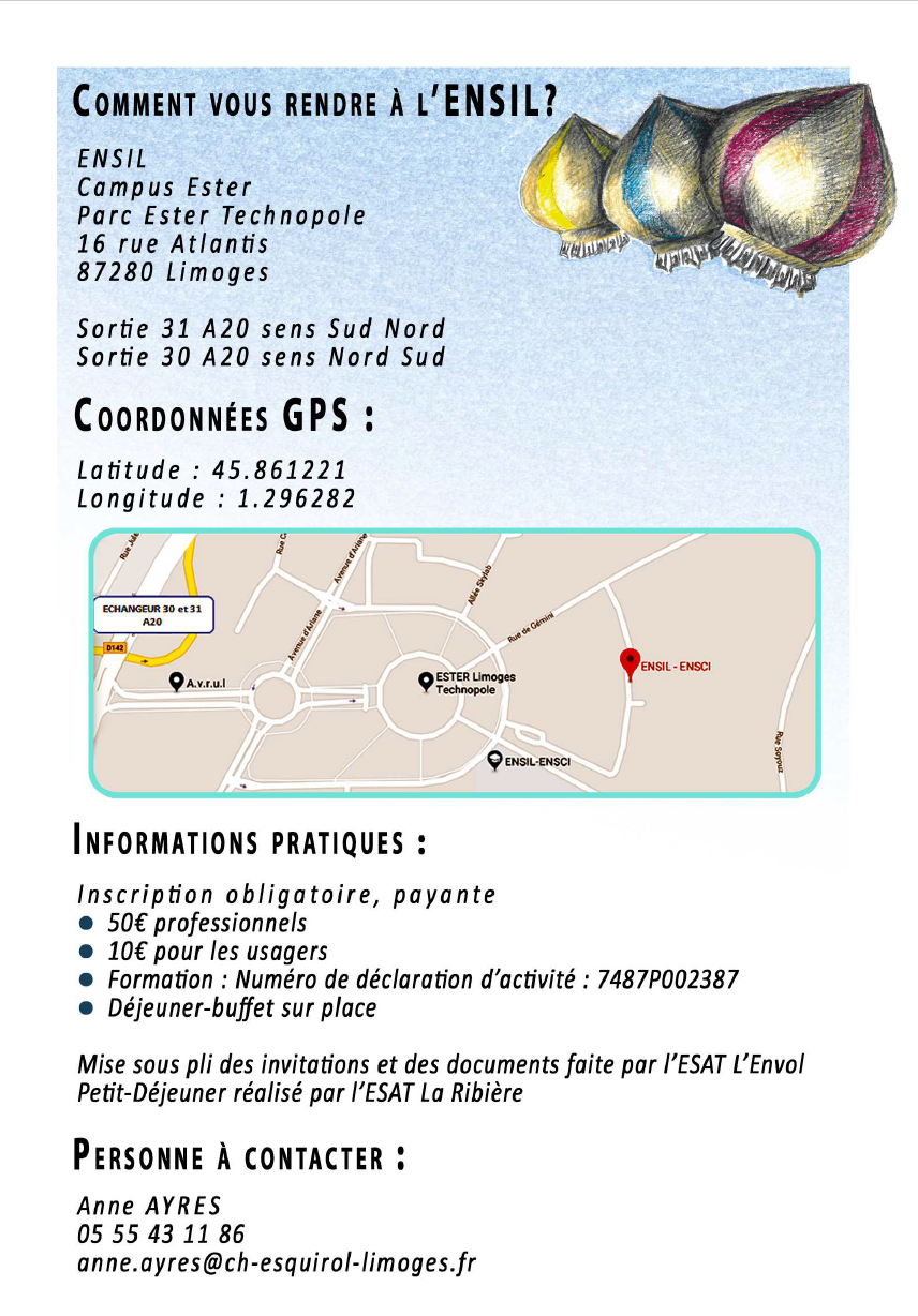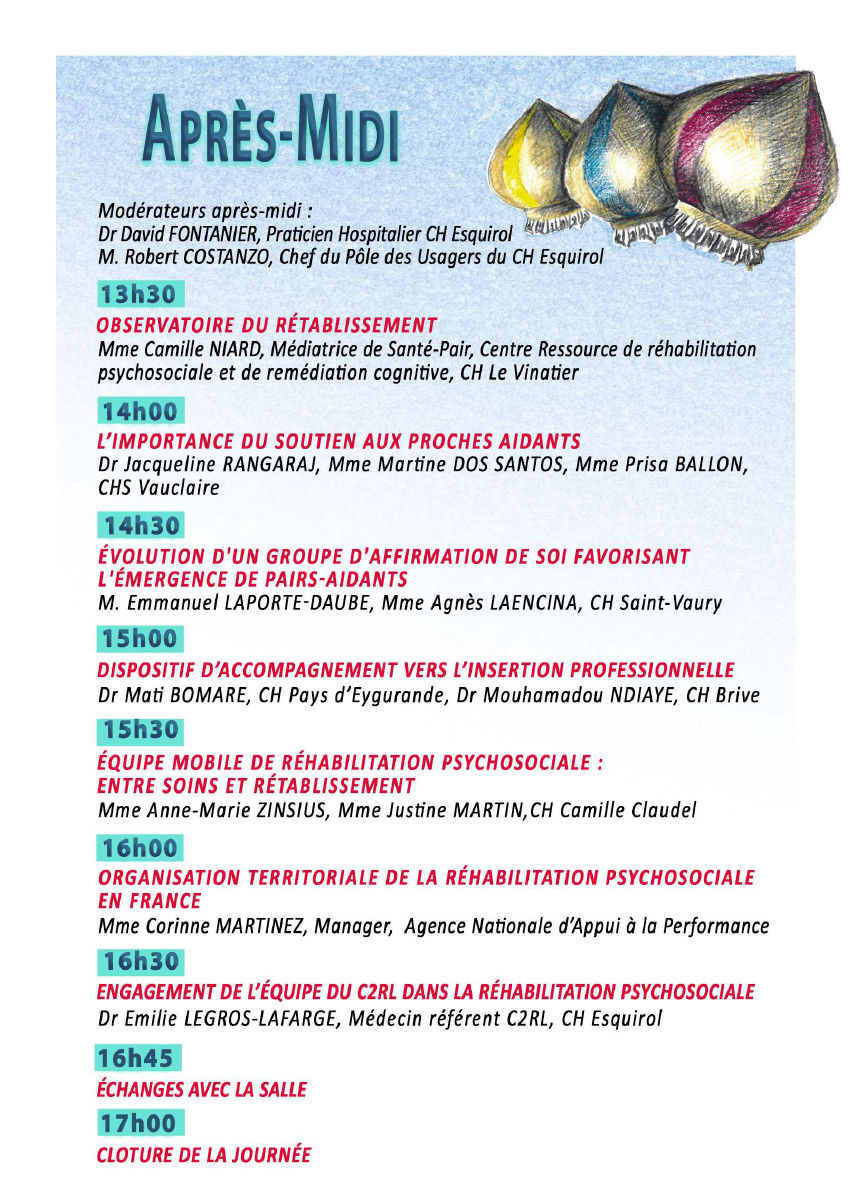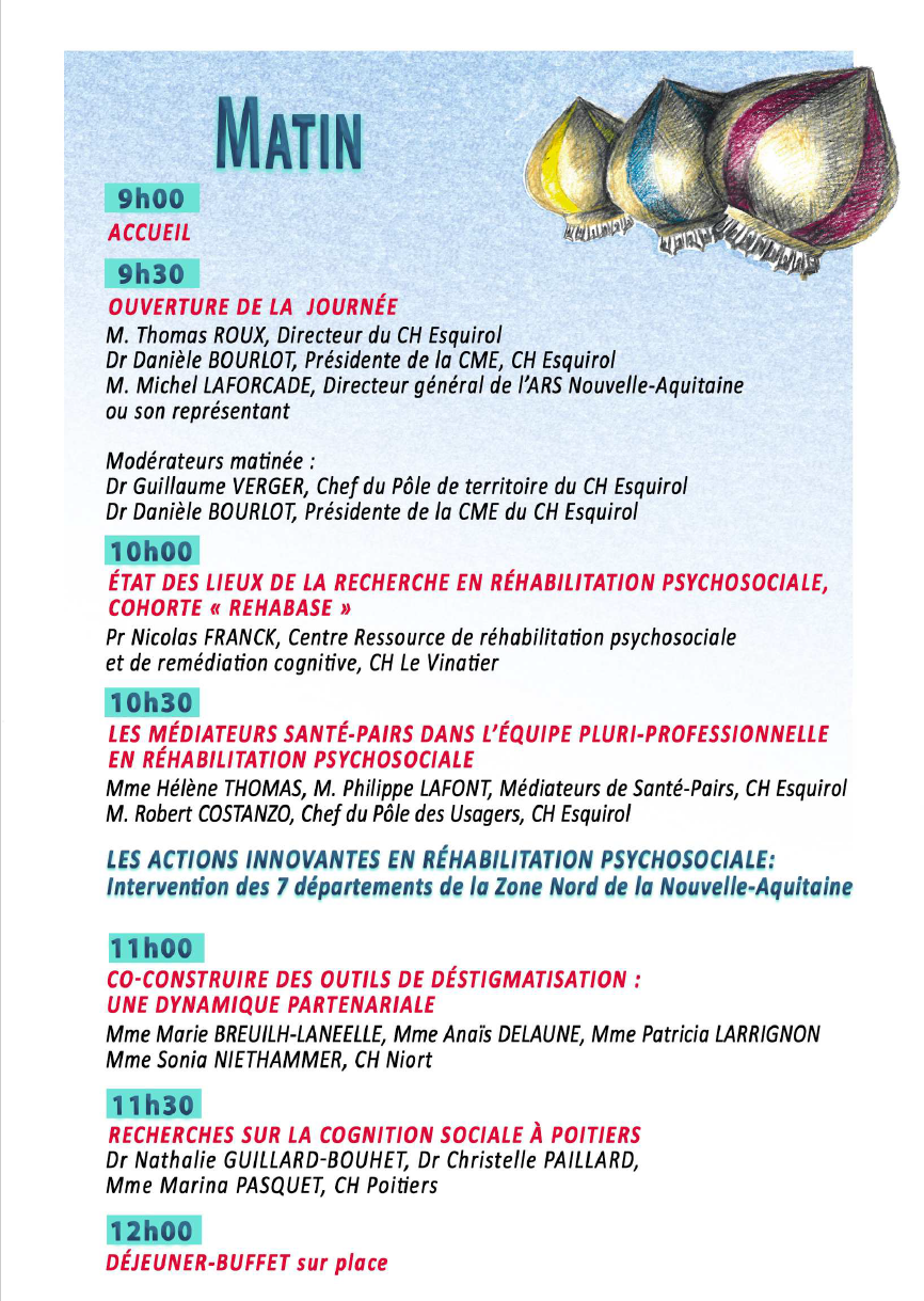 2ème colloque de réhabilitation psychosociale de la Zone Nord de Nouvelle-Aquitaine Accueil > Trouver une structure > Nouvelle Aquitaine > C2RL > Actualités du centre > 2ème colloque de réhabilitation psychosociale de la Zone Nord de (…) 13 novembre 2018 Mercredi 12 décembre 2018 Amphithéatre de l’ENSIL16 rue Atlantis, Limoges - 12:00 Le centre référent de réhabilitation psychosociale de Limoges organise sont 2ème colloque de réhabilitation psychosociale, le 12 décembre 2018. Découvrez le programme riche de cette journée de rencontre annuelle régionale : Inscriptions : Bulletin d’inscription