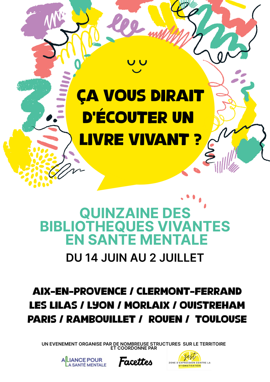 Du 14 juin au 2 juillet, des structures se mobilisent dans plus de dix villes de France pour vous proposer un temps fort de sensibilisation et de rencontre autour de la santé mentale ! Participez à des bibliothèques vivantes, un temps de rencontre authentique et privilégié où « un livre vivant » vous partage une facette de sa vie en lien avec la santé mentale. Un temps fort coordonné par Facettes, Alliance pour la santé mentale et le dispositif ZEST.