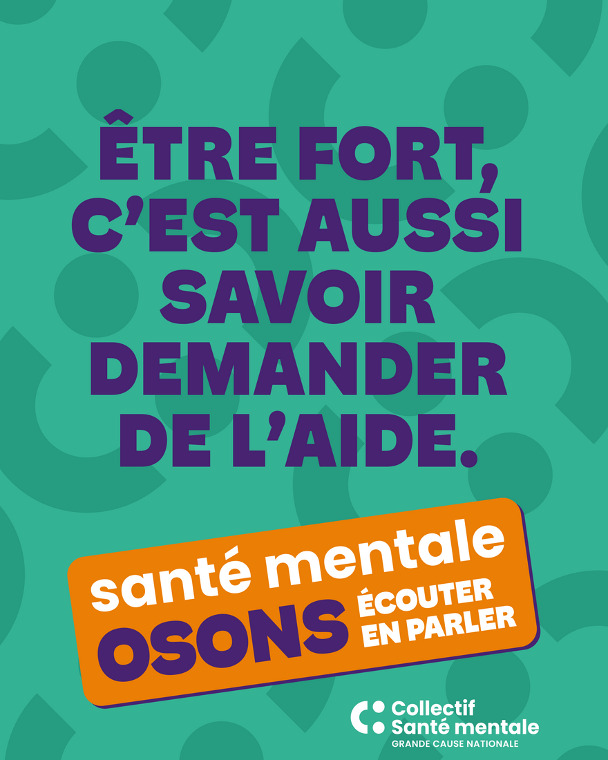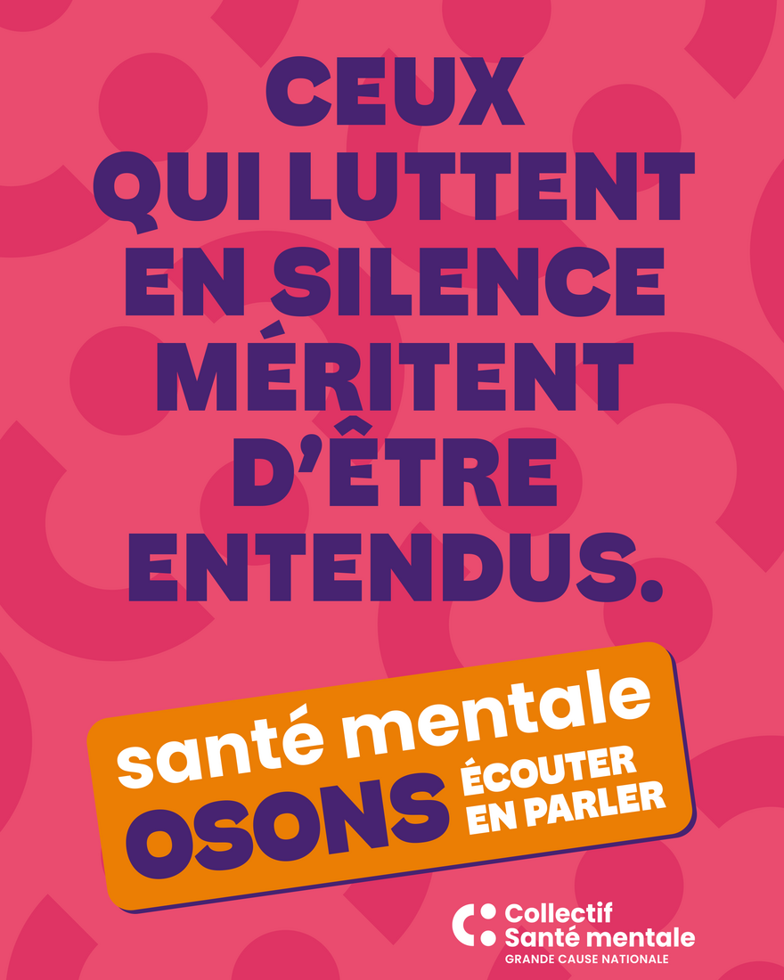 Santé mentale, osons écouter, osons en parler, c’est le slogan de la campagne nationale lancée par le collectif Santé Mentale, grande cause nationale. Son message clé : il est nécessaire de libérer la parole autour de la santé mentale, pour que chacun puisse en parler, être écouté, et aller vers des soins si il en ressent le besoin.