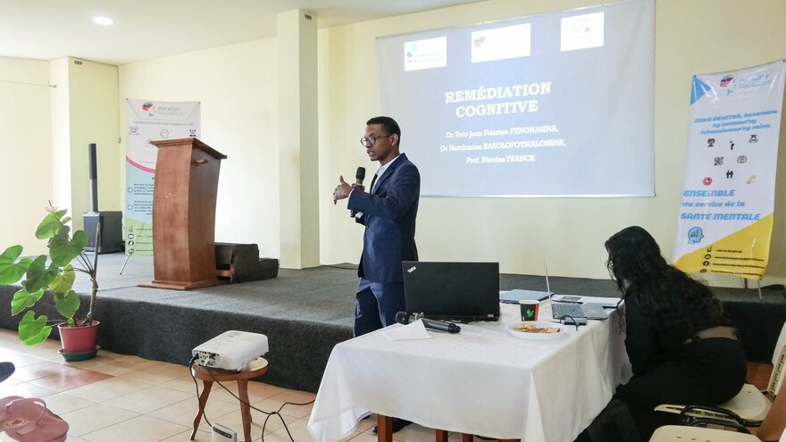 La deuxième partie, présentée par le Dr Toto Jean Felicien Fenohasina, a expliqué ce qu’est l’approche orientée vers le rétablissement et est revenu sur les différentes étapes de la remédiation cognitive.