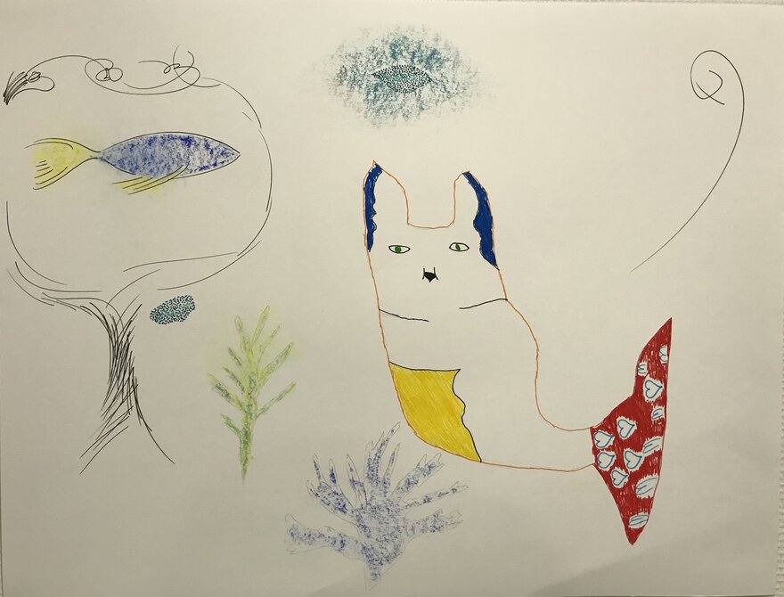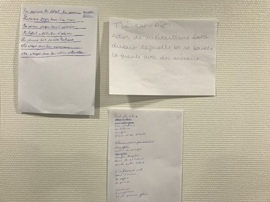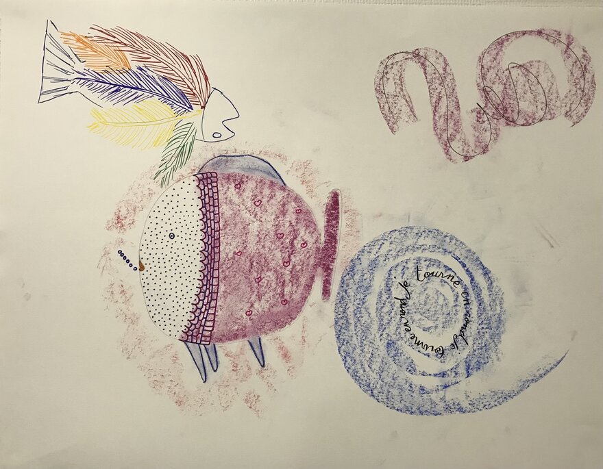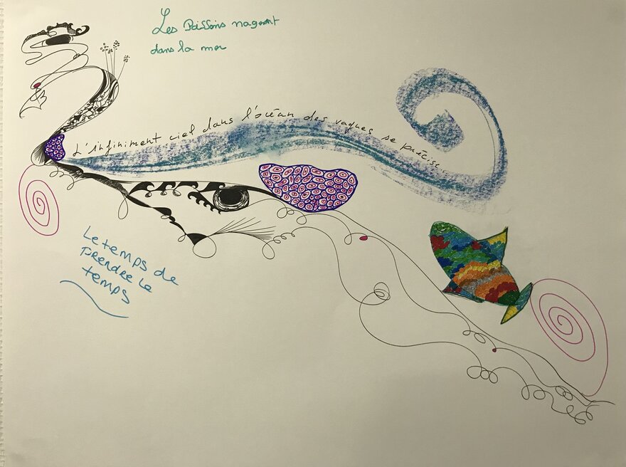 Nous proposons une fois par mois un temps de création collectif, où nous pouvons échanger sur nos productions ! Un neuvième temps a eu lieu lundi 17 janvier 2022, en présentiel. Nous avons le projet de créer ce qui habillera notre salle de réunion "aquarium" et sa grande vitre. Nous avons joué à faire tourner les feuilles pour que chacun.e s’empare du dessin de l’autre et se réapproprie sa forme. Le but est de nous sentir à l’aise à travailler ensemble et de nous inspirer des différents motifs réalisés sous le thème du monde aquatique pour notre prochaine fresque.