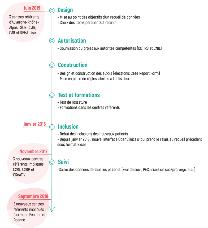 In June 2015, AuRA’s 3 referral centres (SUR-CL3R in Lyon, C3R in Grenoble, and REHALISE in St Etienne) developed the tools and standardised the procedures required to create the REHABase database. These three centres started collecting data from the cohort in January 2016. In November 2017, 2 new reference centres joined the project (C2RP in Bordeaux and C2RL in Limoges; CReATIV, in Poitiers, participates in the project in connection with C2RL). In September 2018, the reference centre in Clermont-Ferrand also joined the project, as did the nearby centre in Roanne.
