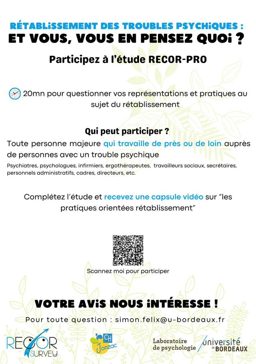Dans le cadre du programme de recherche RECOR à l’Université de Bordeaux, une étude est lancée sur les représentations et pratiques des professionnels au sujet du rétablissement des troubles psychiques.