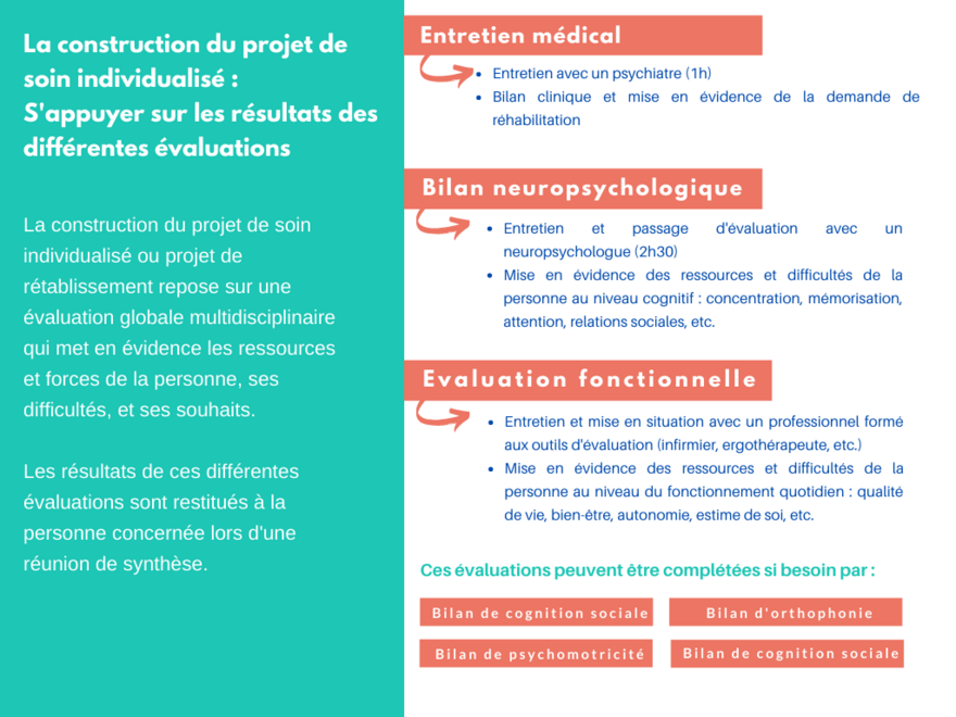 L’évaluation est pluridisciplinaire. Différents professionnels vont s’impliquer dans ce processus : psychiatres, neuropsychologues, psychologues, infirmiers, chargés d’insertion, ergothérapeutes, etc.
