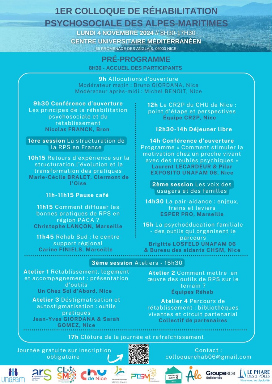 Cette journée, gratuite et ouverte à tous sur inscription obligatoire, contribuera au déploiement et à la structuration de l’offre de réhabilitation psychosociale au service du rétablissement des personnes sur le territoire des Alpes-Maritimes et visera à renforcer la coordination entre les différents acteurs (personnes concernées, familles et proches, professionnels) engagés dans ce processus.