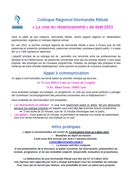 Le deuxième colloque régional en Réhabilitation Psychosociale organisé par Normandie Réhab se déroulera le 15 Juin 2023 à Caen au centre de congrès.