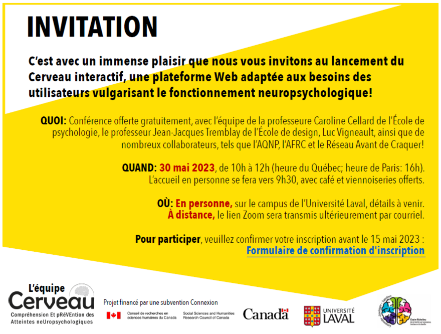 QUOI : Conférence offerte gratuitement, mettant en vedette l’équipe de la professeure Caroline Cellard de l’École de psychologie, le professeur Jean-Jacques Tremblay de l’École de design, Luc Vigneault, ainsi que de nombreux collaborateurs, tels que l’Association Québécoise des Neuropsychologues (AQNP), l’Association Francophone de Remédiation Cognitive (AFRC) et le Réseau Avant de Craquer !