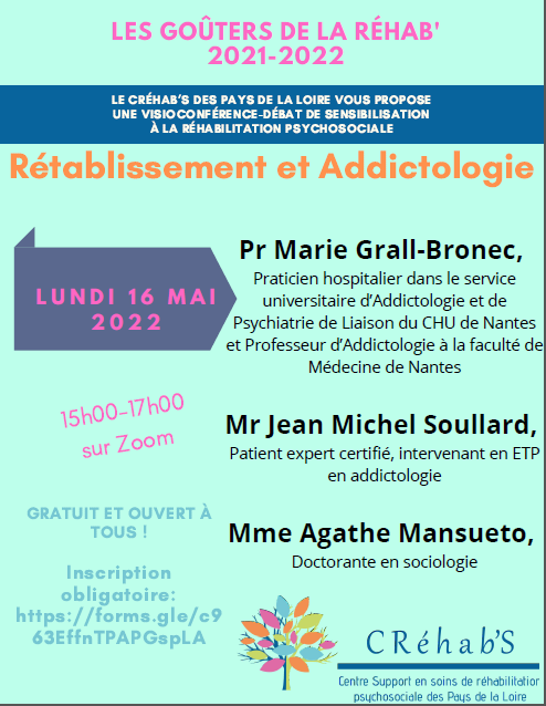 Le prochain Goûter de la réhab’ proposé par le Créhab’s des Pays de la Loire aura lieu le lundi 16 mai de 15h à 17h sur zoom. Il aura pour thème "Rétablissement et addictologie".