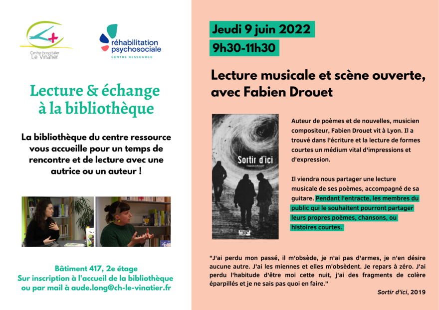 Le jeudi 9 juin 2022, de 9h30 à 11h30, à la Bibliothèque du Centre Ressource, nous avons accueilli Fabien Drouet pour un moment de lecture, de musique, et d’échanges. Il est venu partager avec nous une lecture musicale de ses poèmes, accompagné de sa guitare.