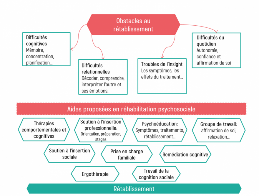 Tous ces troubles sont importants et peuvent entraver le processus de rétablissement. Des troubles cognitifs peuvent gêner la reprise d’une activité professionnelle car il est difficile de travailler si l’on n’arrive pas à retenir les consignes ou à arriver à l’heure par exemple. Le but de la réhabilitation psychosociale est de réduire l’impact de ces difficultés pour favoriser le rétablissement.