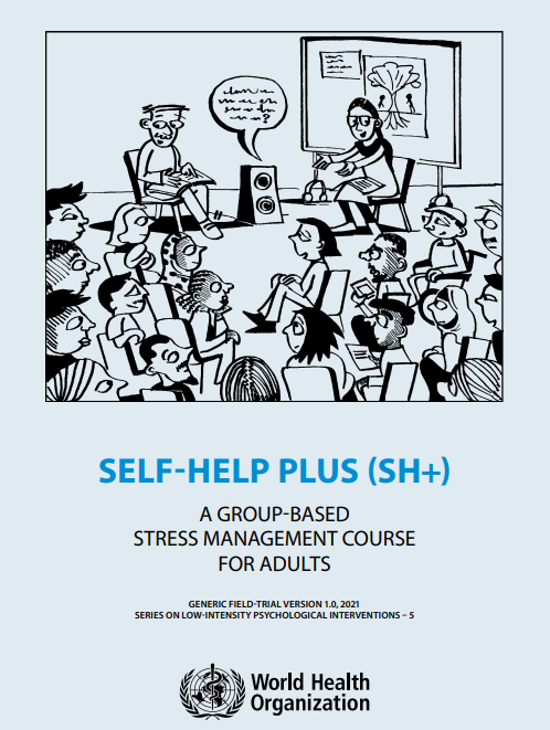Self-Help Plus (SH+) est un cours de gestion du stress en cinq séances de l’OMS destiné à de grands groupes allant jusqu’à 30 personnes. Il est dispensé par des animateurs non spécialisés supervisés qui suivent une courte formation et utilisent un enregistrement audio préenregistré et un guide illustré (Doing What Matters in Times of Stress) pour enseigner les compétences de gestion du stress.