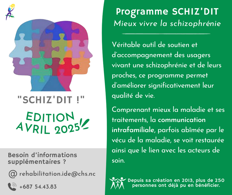 Le CHS A. Bousquet de Nouméa lance la 19ème édition du programme d’éducation thérapeutique " Schiz’dit ! " qui aura lieu du 22 avril au 3 juin 2025.