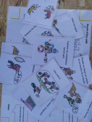 Il consiste à construire son projet en utilisant 72 cartes à jouer. Parmi celles-ci, 12 cartes identifient les domaines de vie (1). Pour chaque domaine de vie, l’usager peut choisir parmi 5 cartes item : « c’est une force », « j’ai besoin d’aide », « c’est un objectif », « c’est un joker » (cela ne me concerne pas ou je n’ai pas envie de traiter cela). Utilisé avec le professionnel, Projeu permet de conforter ou confronter la personne sur la représentation qu’elle a de la réalité de son fonctionnement dans chaque domaine de vie. Une trame de projet personnalisé permet, au fur et à mesure de l’utilisation des cartes, de noter les observations, les objectifs pressentis (par la personne et/ou le référent de parcours -coordinateur-). Cette trame peut être utilisée par d’autres professionnels afin de compléter le bilan de la personne avant la réunion de « projet ».