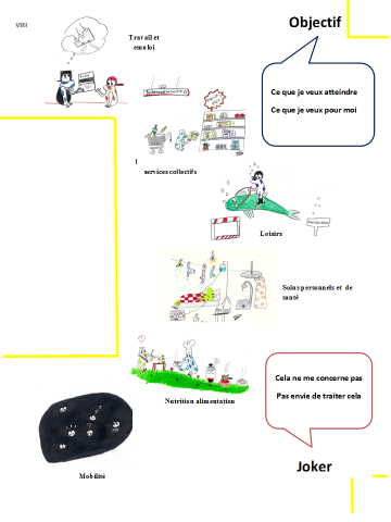 - Faire le point sur sa situation dans 12 domaines de vie (mobilité, vie relationnelle, soins de santé, soins personnels, loisirs, Apprentissages et application des connaissances, …)