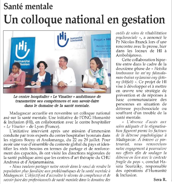 Une délégation du centre hospitalier Le Vinatier et du Centre ressource de réhabilitation psychosociale rencontre cette semaine la délégation d’HI (Handicap International – Humanity & Inclusion) à Madagascar dans la cadre du projet Hifali.