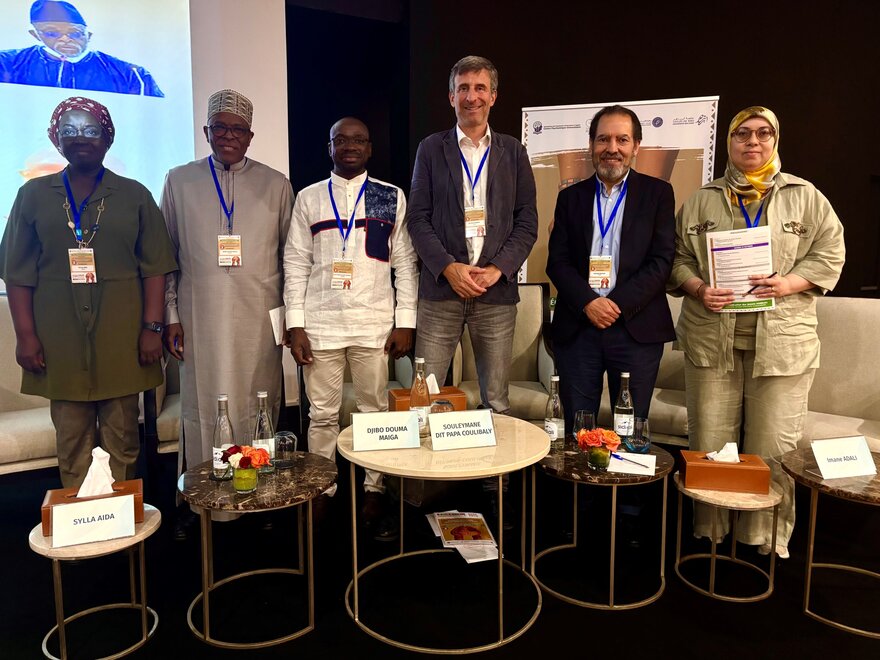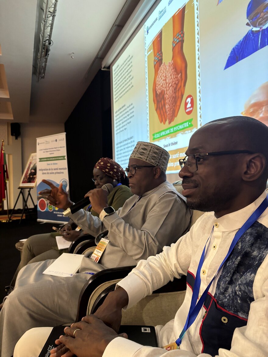 De gauche à droite, les trois intervenants (la Pre Sylla Aida, le Pr Djibo Maiga Douma et le Pr Souleymane Coulibaly), les deux discutants (le Pr Nicolas Franck et le Pr Hassan Rahioui) et la modératrice (la Pre Imane Adaldi) de l’une des sessions sur l’intégration des soins de santé mentale dans les soins primaires et les modèles innovants.
