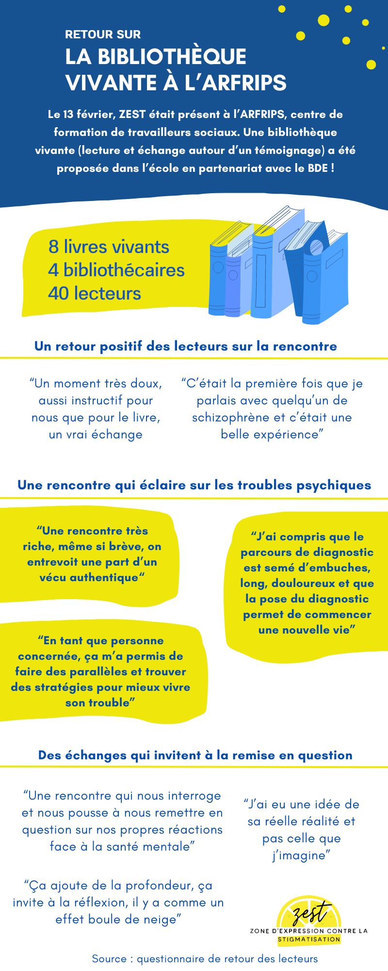 Le 13 février, ZEST était présent à l’AFRIPS, école de travailleurs sociaux pour proposer aux étudiant.es et enseignant.es une bibliothèque vivante lors du temps de pause du midi ! 8 livres vivants ont pu partager leurs textes auprès de 40 lecteurs et lectrices. Retrouvez dans cette synthèse visuelle un retour sur cet évènement !