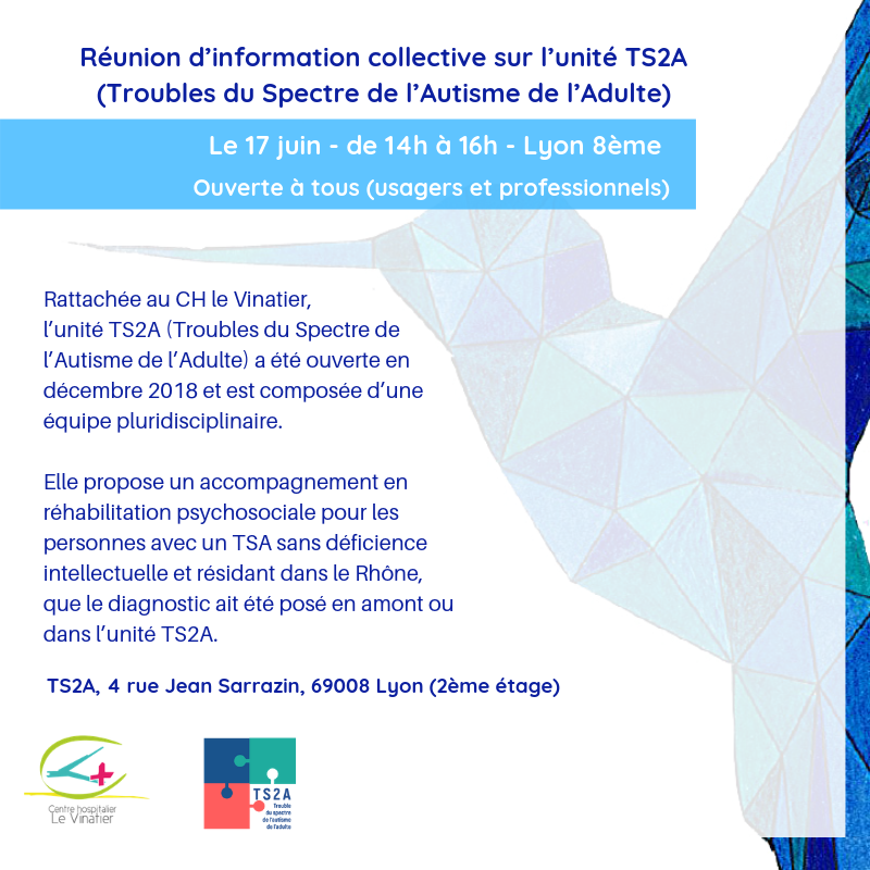 Le 17 juin de 14h à 16h, nous vous proposons une réunion d’information collective pour vous présenter l’unité TS2A (dans les locaux du centre ressource de réhabilitation psychosociale, 4 rue Jean Sarrazin, 69008 Lyon). Ouverte à tous (usagers et professionnels).