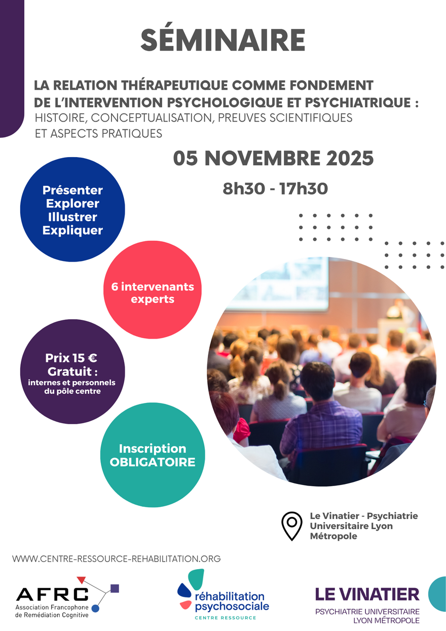 Un séminaire organisé par le Réseau Lyonnais des Troubles de Personnalité (rl-tp.fr) vous est proposé sur la thématique « La relation thérapeutique comme fondement de l’intervention psychologique et psychiatrique : histoire, conceptualisation, preuves scientifiques et aspects pratiques »