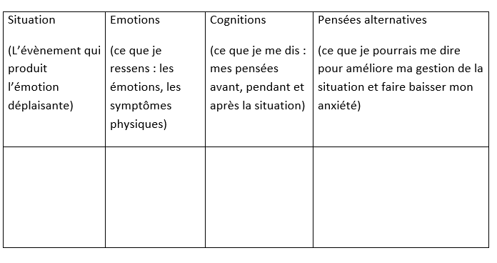 Le thérapeute peut proposer différentes grilles à remplir, comme les colonnes de Beck (voir ci-dessous).