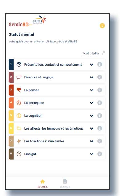 Développé par le GRIEPS, Semio8G est une application web gratuite de sémiologie psychiatrique. En s’appuyant sur les références majeures de la sémiologie psychiatrique, elle offre à l’utilisateur la possibilité de monter en compétence dans sa capacité à observer, organiser, synthétiser, structurer et transmettre sa vision clinique. Il se veut un support capable d’assister l’ensemble des professionnels confrontés à la souffrance psychique.